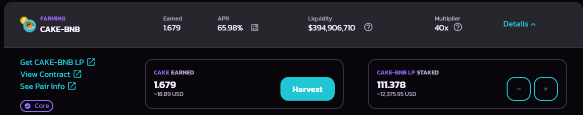 現在、「0.925CAKE:14.42ドル」が未収穫となるため、1日あたり約74.17ドルの収益となった。